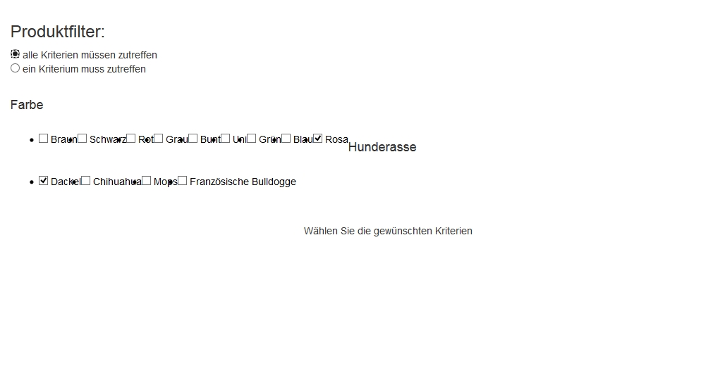 "Erweiterter Produktfilter": Sieht immer noch so aus im Bootstrap Template. Und wenn man auf ein Kriterium klickt, passiert nichts...