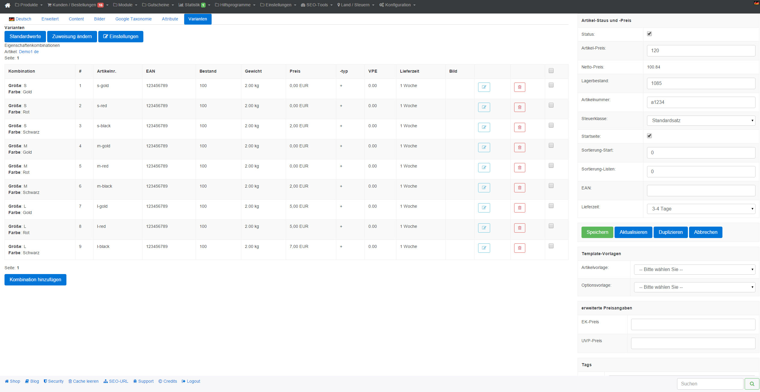 Verkaufen Sie Produkte in beliebig vielen unterschiedlichen Varianten, wie zum Beispiel Größe, Farbe, Material etc. Ihre Kunden können so selbst entscheiden, in welcher Ausführung Sie einen Artikel kaufen möchten. Zu jeder Variante eines Artikels können Sie eigene Bilder, Preise und Lagerbestände hinterlegen. Auch mehrdimensionale Abhängigkeiten sind mit diesem System problemlos darstellbar.