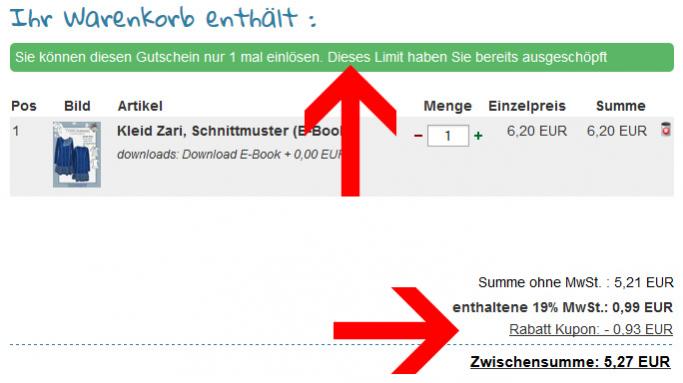 Neukunden erhalten in der Bestätigungsmail zum Kundenkonto nun automatisch den Code. Sie können ihn aber mehrfach einlösen! Es wird ab dem zweiten Mal zwar im Warenkorb ein Hinweis eingeblendet ("Sie können diesen Gutschein nur 1 mal einlösen. Dieses Limit haben Sie bereits ausgeschöpft"), der Rabatt wird aber trotzdem abgezogen! Siehe auch Screenshot!