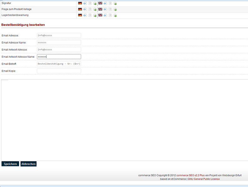 suche schon länger, wie ich die Bestätigungs Email Vorlage ändern kann, weil da meine Adresse drin ist statt die des Shops, ich habe auch schon viel hier gelesen, aber nichts hilft, ist es denn normal, dass die Email Vorlagen (html) leer sind?? (s. Screenshot) oder habe ich was vergessen vorher zu aktivieren? [ATTACH=CONFIG]257[/ATTACH]