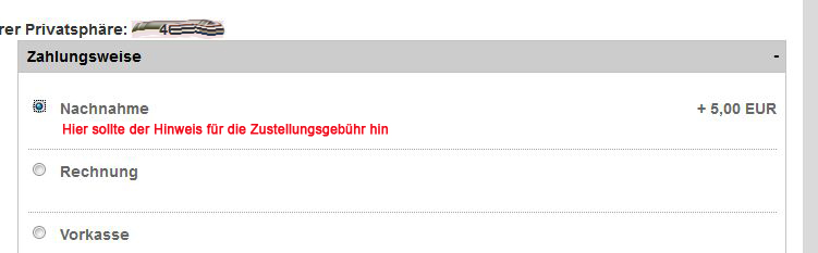 Es ist jetzt natürlich falsch, wenn wir die zwei Euro noch bei uns auf die Rechnung draufpacken. Aus diesem Grund wäre es aus unserer Sicht am sinnvollsten, wenn wir bei der Zahlart "Nachnahme" noch einen freitextlichen Hinweis eingeben könnten, der z.B. wie in der Grafik im Anhang dargestellt wird.Sind wir allein mit der Problematik, kann ich mir kaum vorstellen!?