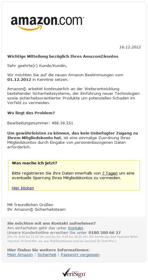 Eine wirklich sehr gut gemacht Phishing-Mail (hab sie mal angehängt). Für jemand unbedaften sicherlich gefährlich. Mir fällt zwar sofort auf, daß nicht mit richtigem Namen angesprochen wird und das so Dinger eigentlich immer quatsch sind, was mich aber an der Mail wirklich stört ist der Empfänger: