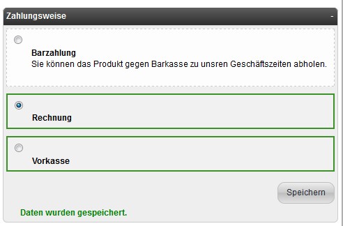 Der AjaxCheckout ist aktiviert - wähle ich jetzt eine Bezahlart direkt über den Radio aus, erscheint der Text daß gespeichert wurde und ein grüner Rahmen kommt. Klicke ich dann auf das Feld der anderen Zahlart bleibt der grüne Rahmen bei der Bezahlart die via Radio ausgewählt wurde, aber bei der soeben geklickten erscheint er auch - ebenso die "gespeichert" Nachricht.Dazu wechselt beim klick auf .moduleRow die klasse auf .moduleRowSelected. Das passiert im übrigen auch bei den Versandmodulen.